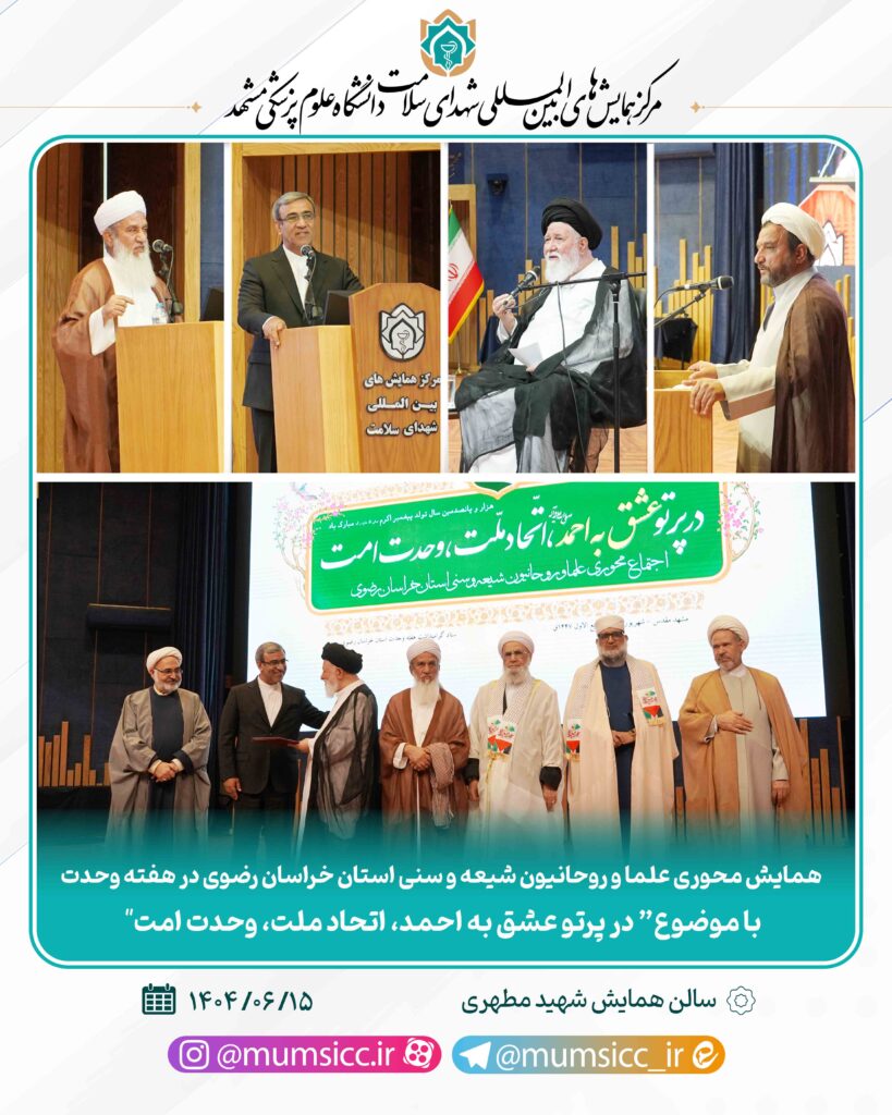 آیتالله سید احمد علمالهدی در همایش محوری” در پرتو عشق به احمد، اتحاد ملت، وحدت امت” که با حضور علمای شیعه و سنی در سالن همایش شهید مطهری مرکز همایش های بین المللی شهدای سلامت برگزار شد، اظهار کرد: این محفل ارزشمند به عنوان نماد برتر اسلام و مسلمانان که در برابر چالشهای جهانی ظاهر میشود، ضرورت وحدّت تمام جوامع اسلامی را، با در نظر گرفتن تمامی اختلافات قومی، مذهبی و فکری، بهوضوح نشان میدهد.