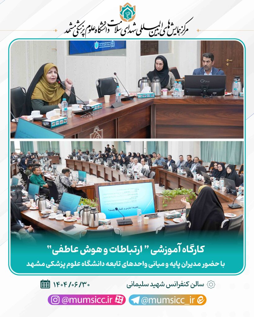 کارگاه آموزشی “ ارتباطات و هوش عاطفی” با حضور مدیران پایه و میانی واحدهای تابعه دانشگاه علوم پزشکی مشهد و ارائه سرکار خانم دکتر سلطانی در سالن کنفرانس شهید سلیمانی مرکز همایش های بین المللی شهدای سلامت برگزار گردید.